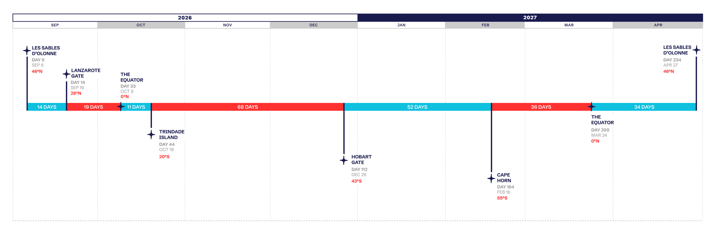 The target dates and locations below represent an estimated time of arrival at each of the key gates and waypoints on Spirit’s circumnavigation.